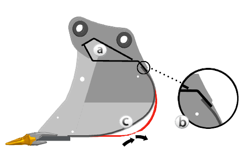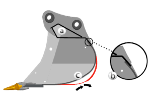- Tvar Dual Radius zvětšuje vůli paty, což snižuje tažení a opotřebení (červená čára je konstrukcí bez duálního poloměru, kde dno kbelíku může při kopání táhnout proti zemi více) (c)