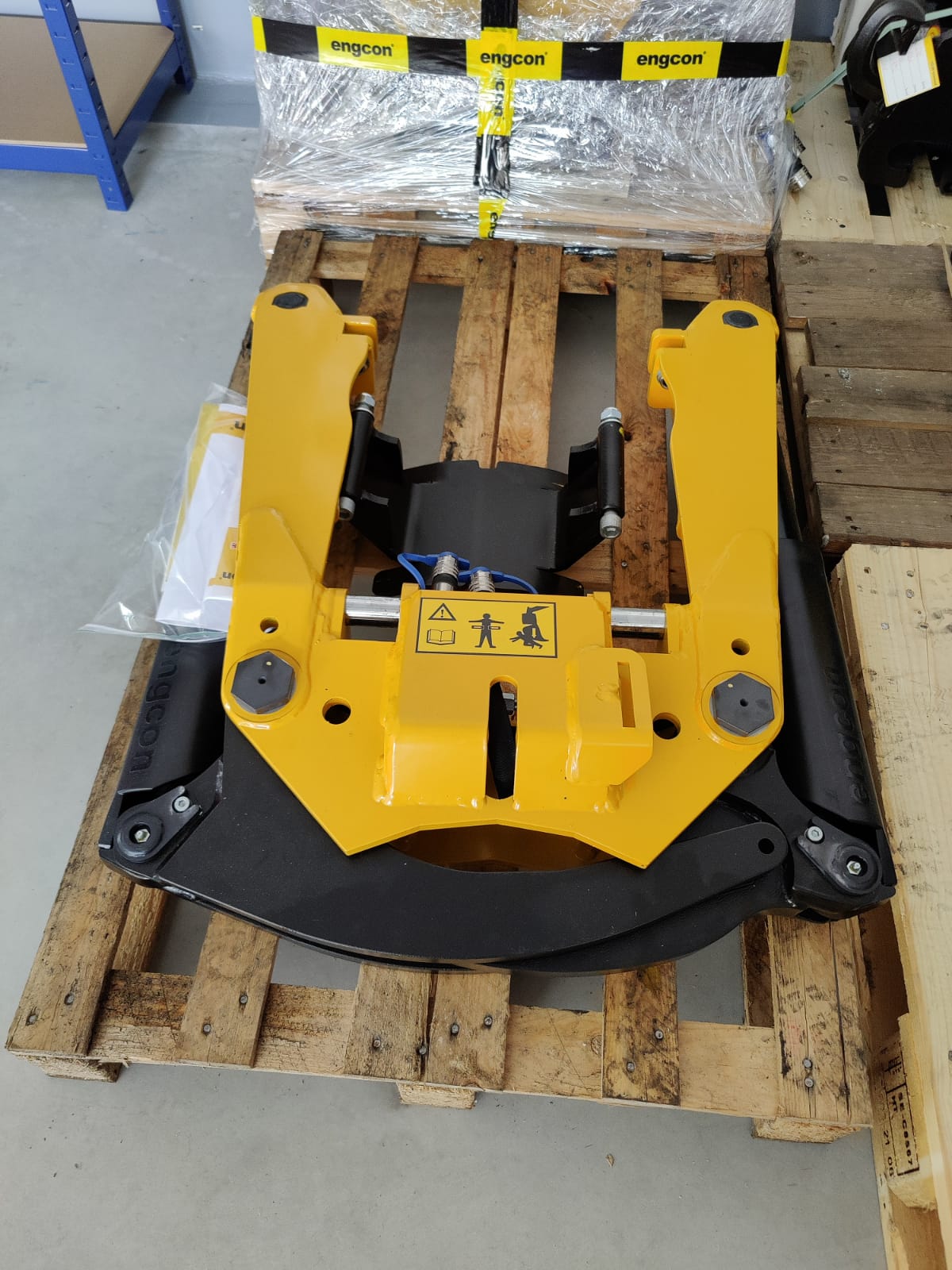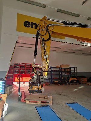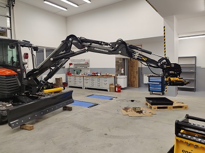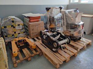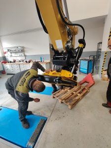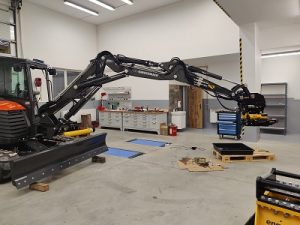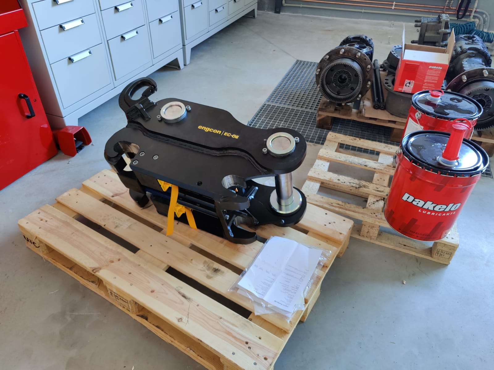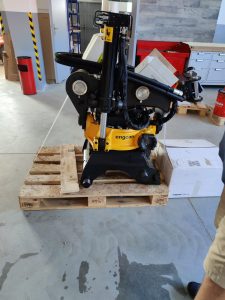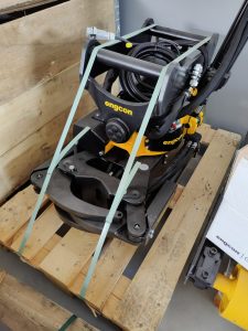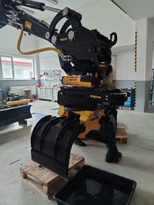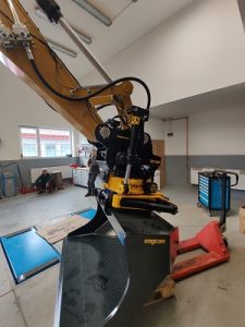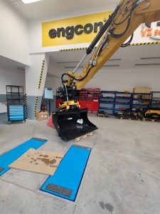 Tiltrotátory Engcon čekající na montáž, připravujeme je včetně příslušenství a to přídavných kleští, vibrační desky a sortirovacího drapáku.
