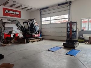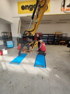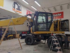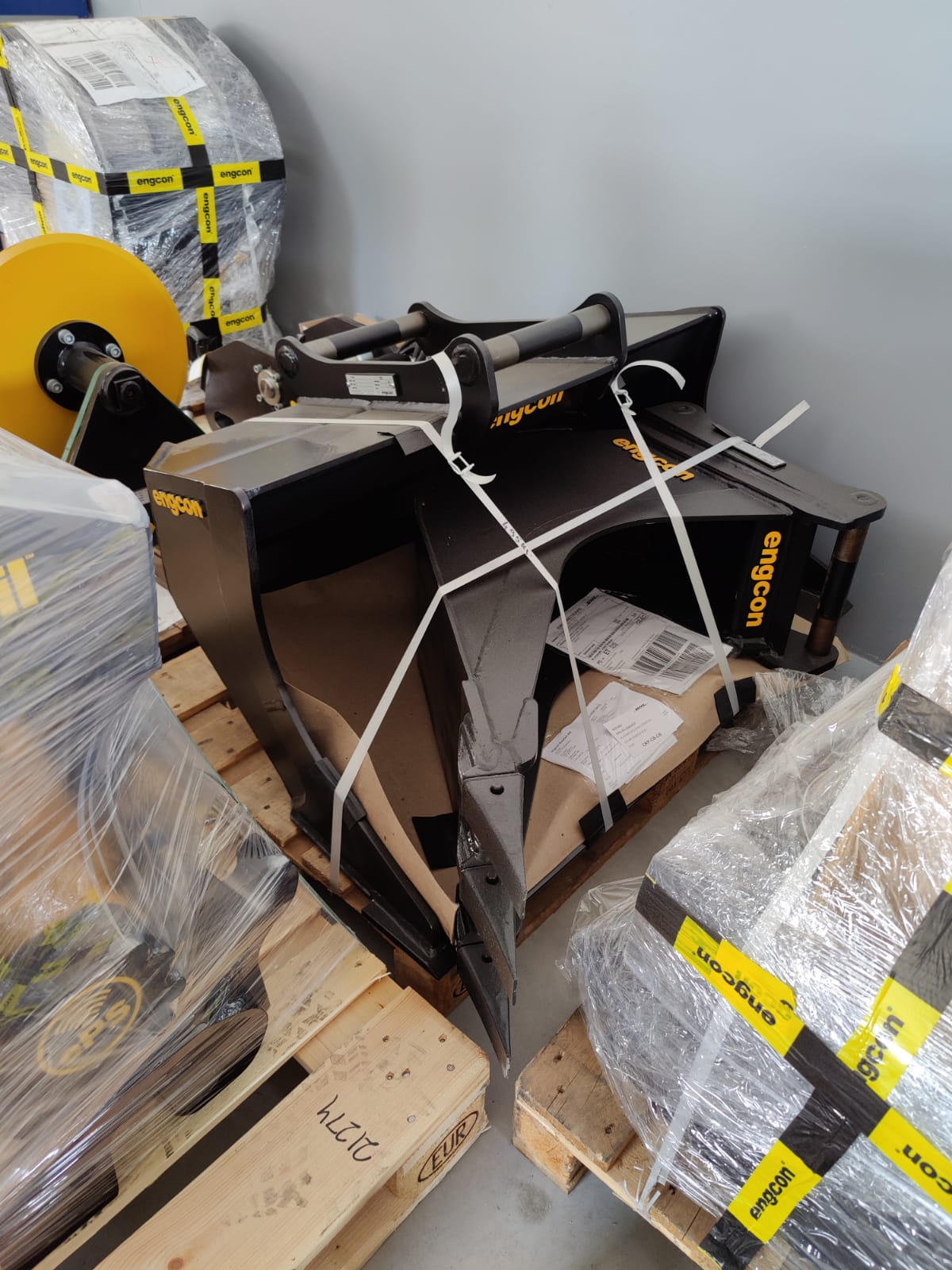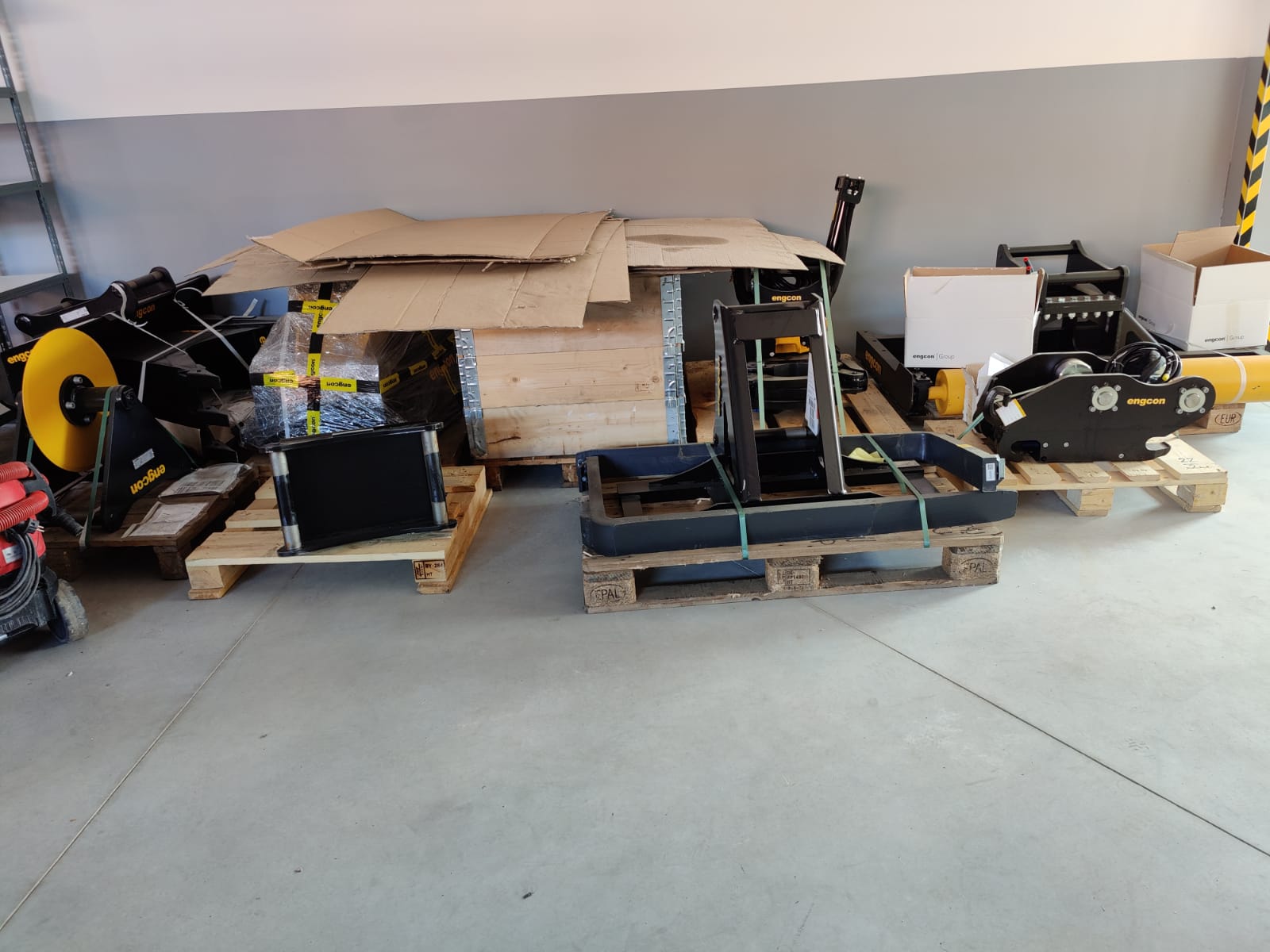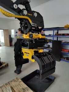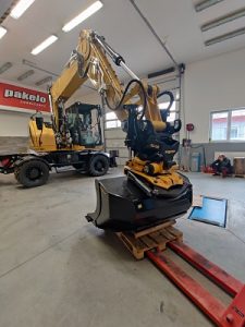 Tiltrotátory Engcon čekající na montáž, připravujeme je včetně příslušenství a to přídavných kleští, vibrační desky a sortirovacího drapáku.