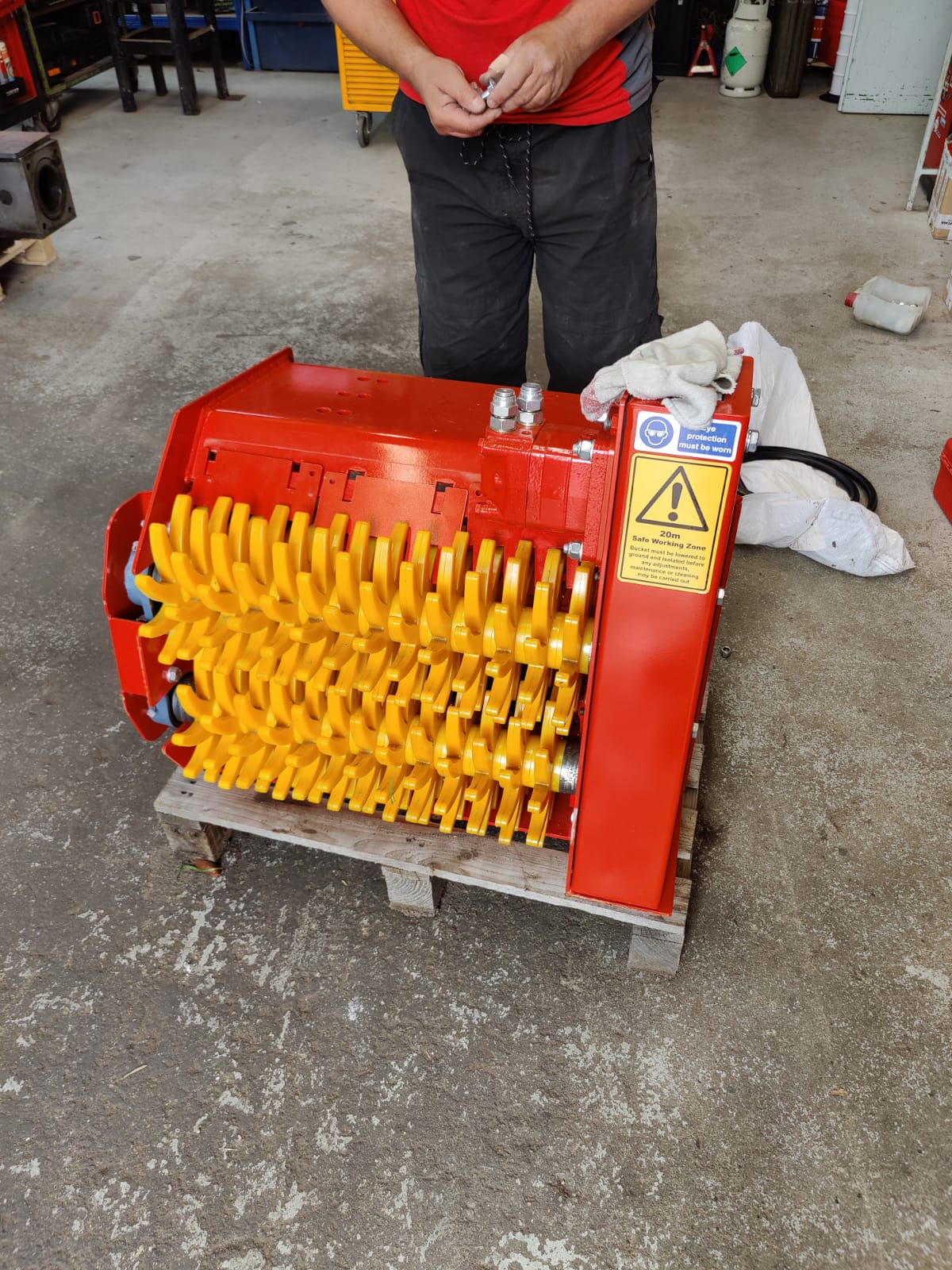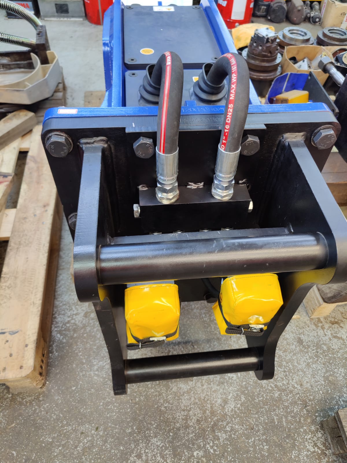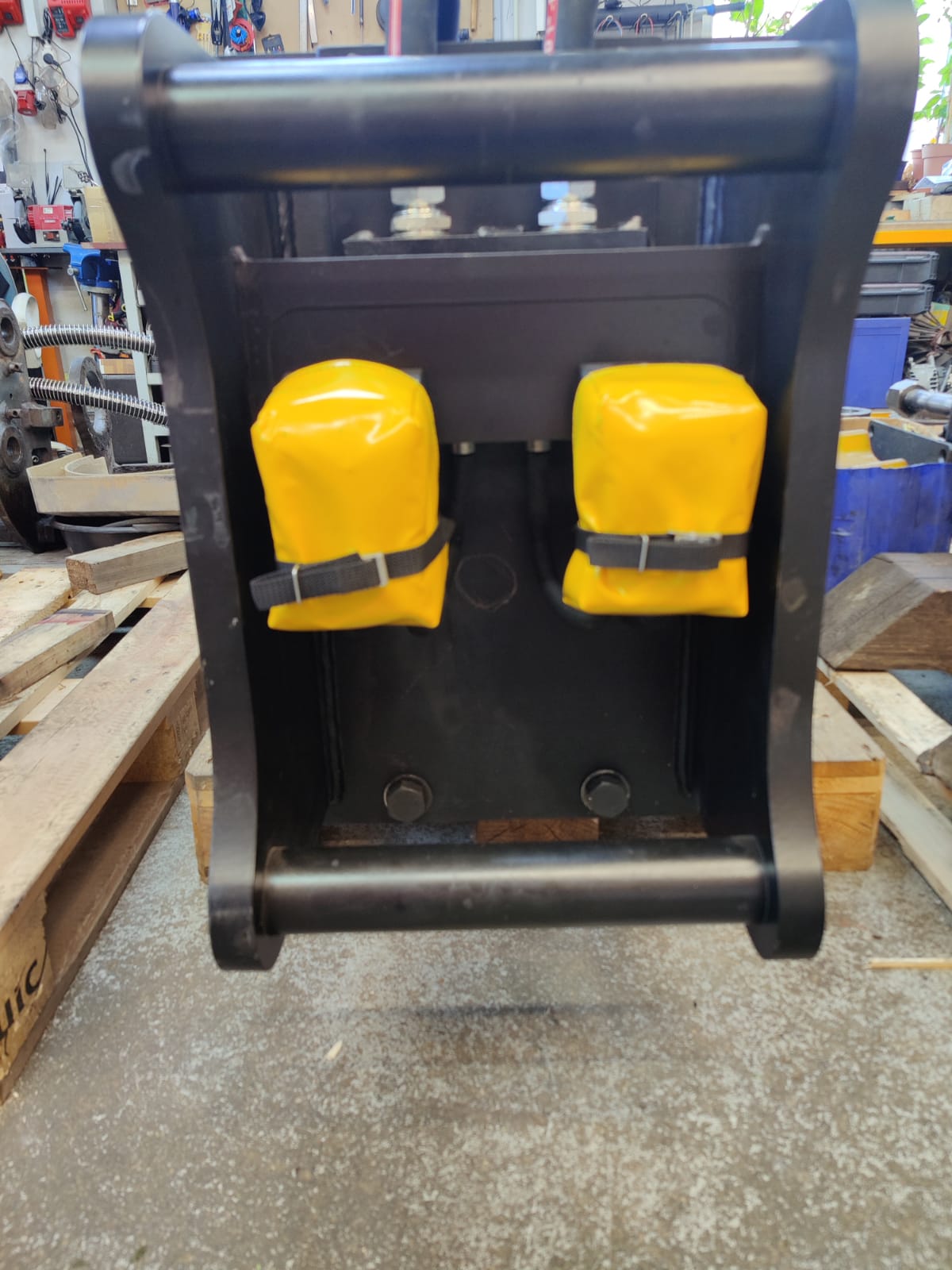Tiltrotátory Engcon čekající na montáž, připravujeme je včetně příslušenství a to přídavných kleští, vibrační desky a sortirovacího drapáku.