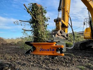 Nůžky na stromy koala jsou hydraulické nástavce, které se připojují k linkám kladiva rypadla. Hydraulický válec protlačí hranu Hardoxu skrz strom a ustřihne ji. Výhodou je, že když je strom pořezán, může být umístěn na bezpečné místo.