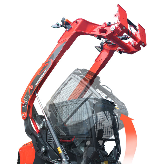 - Hydraulicky ovládané naklápění kabiny umožňuje snadný přístup k rozdělovači a hlavním komponentům
